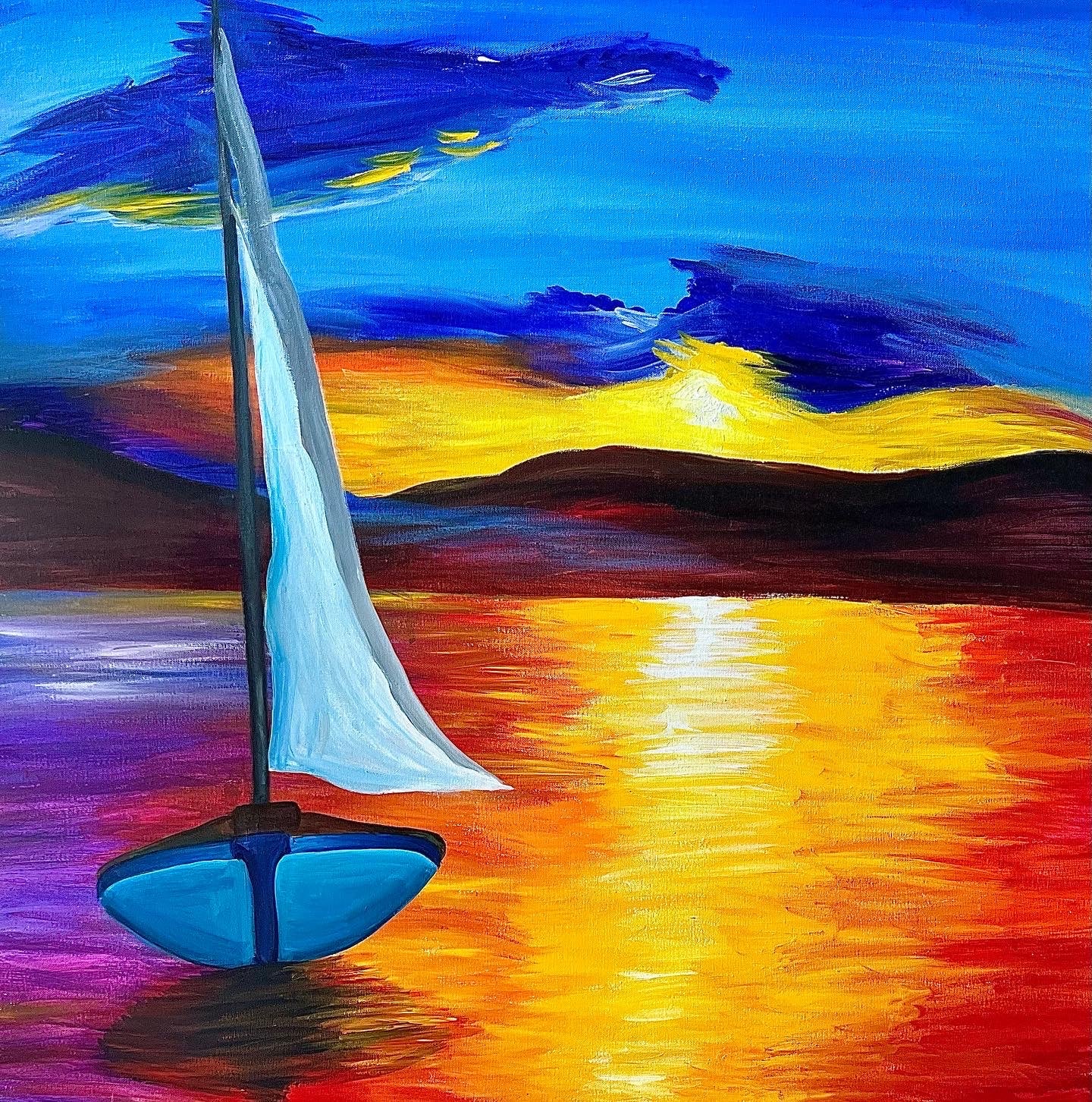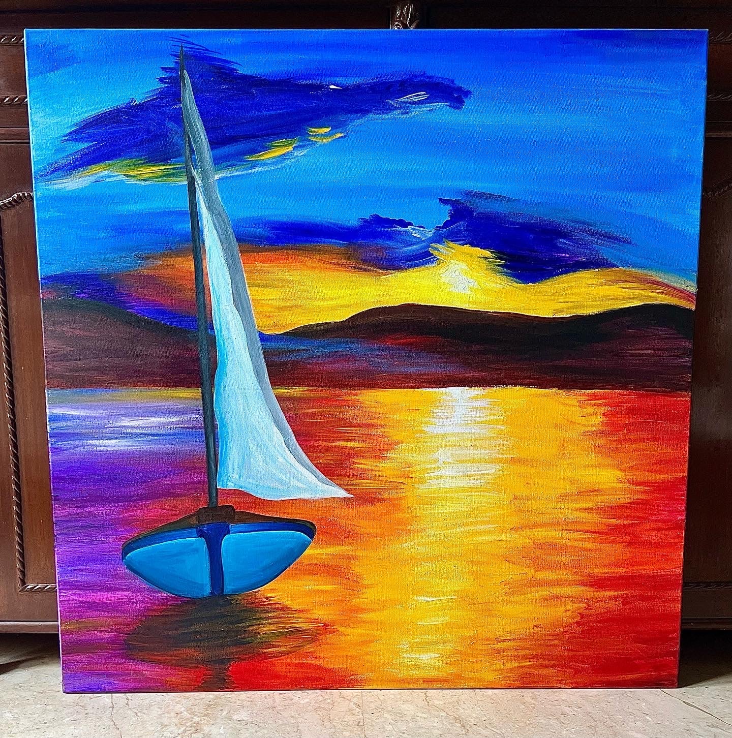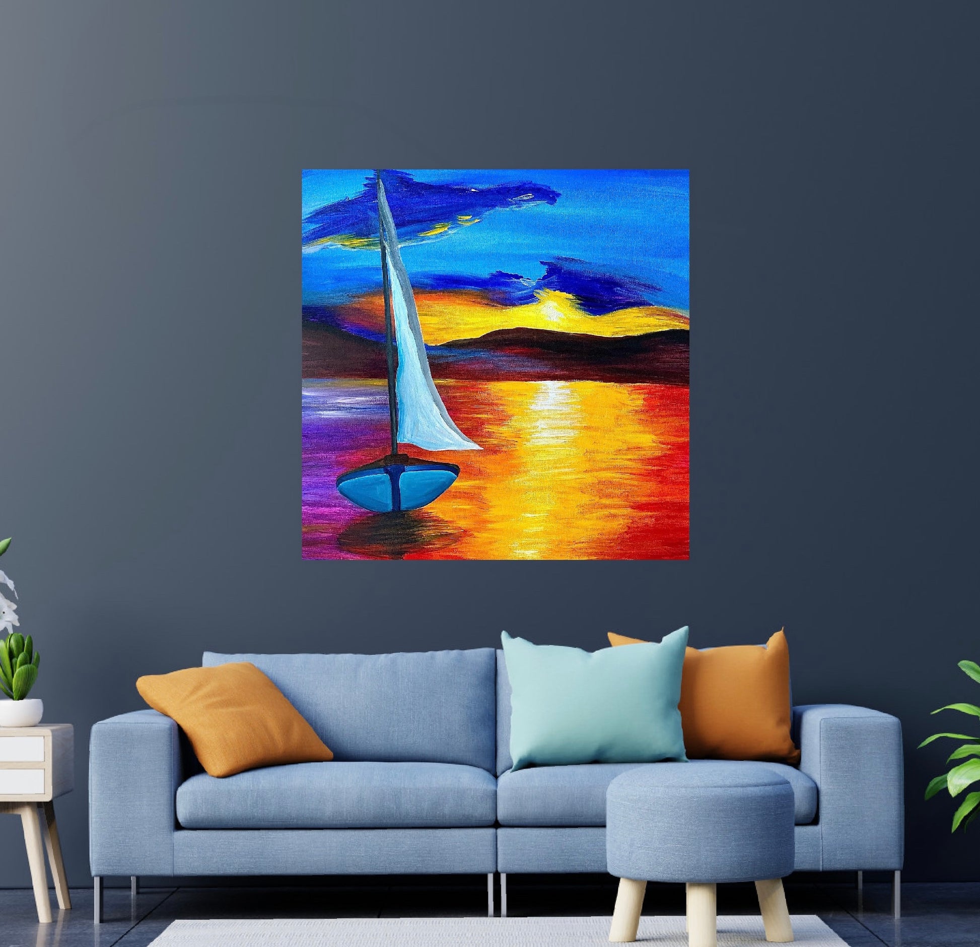 Bring the magic of a peaceful sunset sail into your life with our "Sailing Through Sunset" acrylic painting.